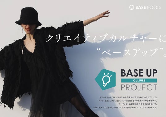 スマートフード完全栄養食である「BASE FOOD」を日常的に取り入れていただくことで、アート・芸能・ファッションシーンで活躍するクリエイターやデザイナー、アーティストの健康的なカラダづくりや、パフォーマンス向上の“ベースアップ”をサポートしていくプロジェクトです。