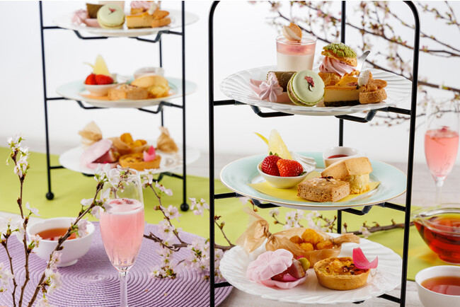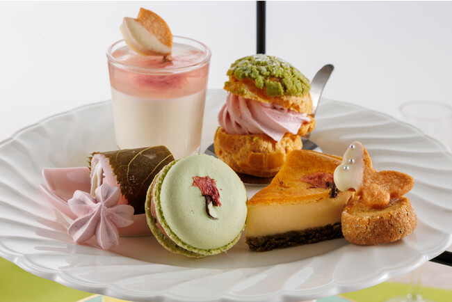 3段のティースタンドには、桜の花びらを浮かべた桜色のジュレと甘酒のジュレを重ねた“ヴェリーヌ”や、春らしい鮮やかな翡翠色のクッキー生地を乗せ、焼き上げたシュー生地に桜の花びらのムースをたっぷりと絞った“シュークリーム”。桜の葉がアクセントの和スイーツなど、桜を存分に楽しめるスイーツが並びます。