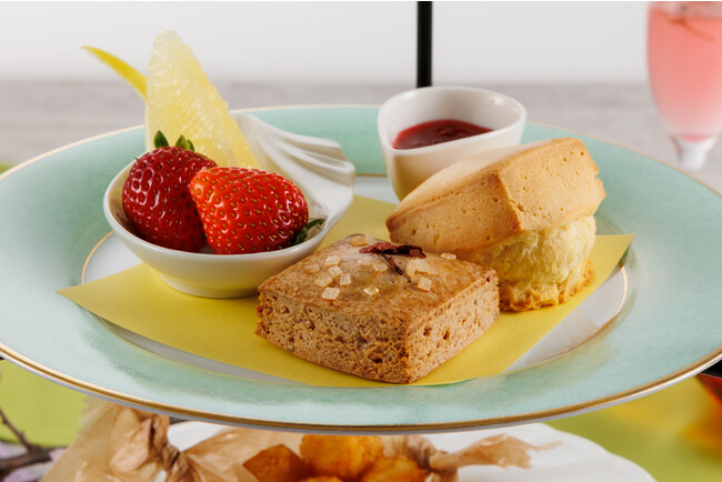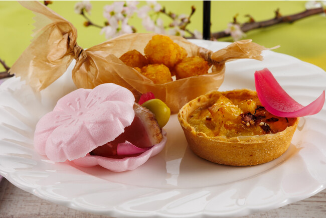 また、ほのかに優しい桜の薫りが漂う“スコーン”や、桜の最中と一緒にお楽しみいただける大阪産「河内鴨」の鮮度の良さと脂の旨味を活かした“生ハム”。桜のテイストと筍の食感が絶妙の“キッシュ”など、シェフこだわりのセイボリーもご堪能いただけます。