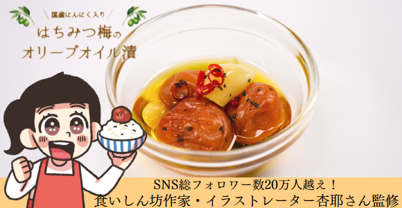 和歌山県の世界遺産・熊野参詣道の玄関口にて創業100年以上の歴史を誇る老舗梅干し屋紀州梅本舗(和歌山県西牟婁郡白浜町、代表取締役社長:大岩崇)は2021年に発足したプロジェクト「UMELAB by 紀州梅本舗(https://www.ume-honpo.co.jp/?tid=8&mode=f47)」のアンバサダーにSNSフォロワー数20万人超えの食いしん坊の作家・イラストレーター杏耶さん(@ayatanponpon)を迎え、この度2023年2月15日(水)に初のコラボ商品である「はちみつ梅のオリーブオイル漬」(https://www.ume-honpo.co.jp/?pid=172777819)の販売を開始致します。
