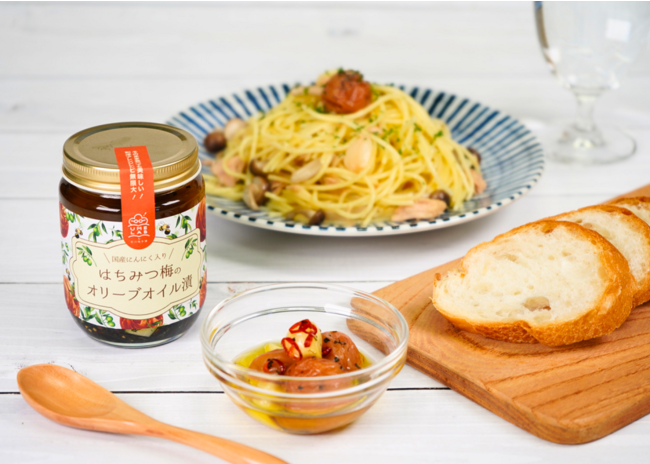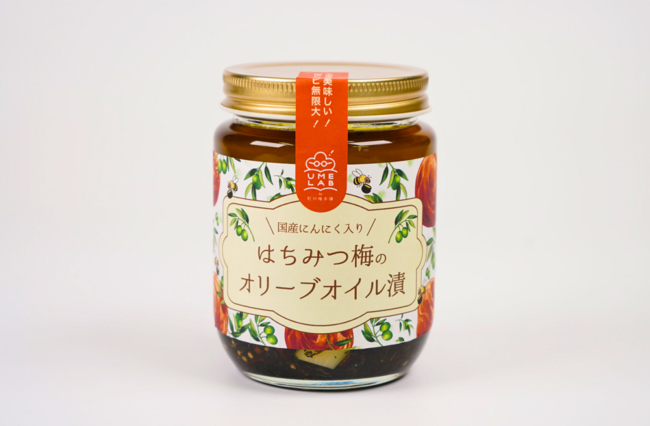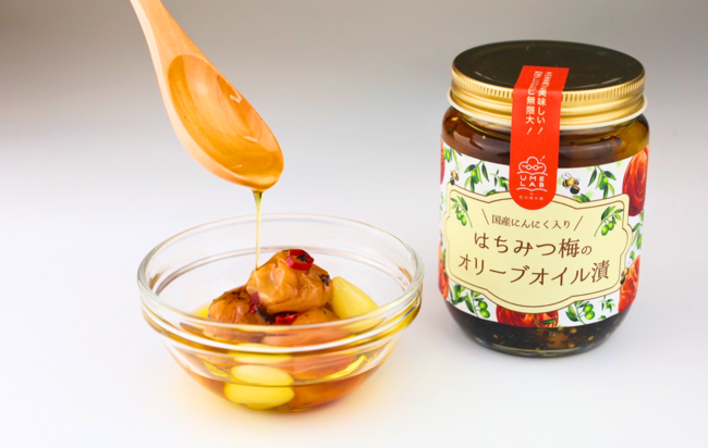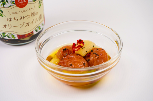梅干しには、皮が柔らかく実がふっくらしている紀州南高梅を使用した弊社人気NO.1のはちみつ梅を採用。様々な味の梅干しで商品試作をしてみたところ、梅のフルーティーさとオリーブオイルのまろやかさとの相性が非常に良いはちみつ梅となりました。他の材料に関しても、健康に良いと言われているエクストラバージンオリーブオイルや国産にんにく等こだわりを持って選ばせて頂きました。