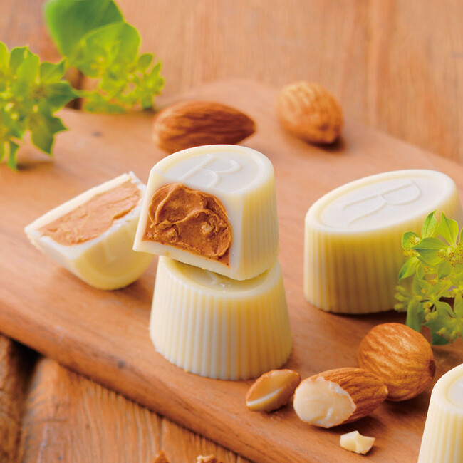 コク豊かなアーモンドプラリネのクリームを、ホワイトチョコレートに閉じ込めました。食感の良いクッキークランチがアクセント。アーモンドの香ばしさをやさしいミルクの風味が包み込む、今だけのショコラです。