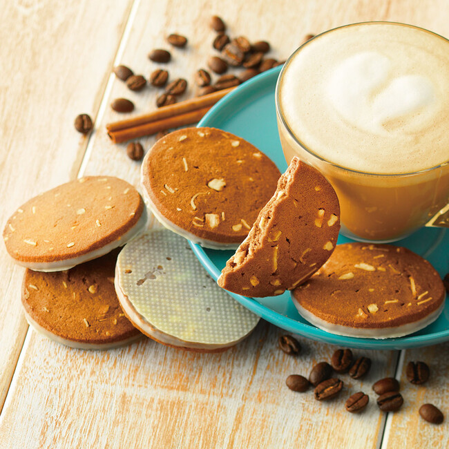 コーヒー風味のほろ苦いクッキーの片面に、まろやかなホワイトチョコレートをコーティングしました。コーヒーのほろ苦さと香ばしさに、やさしいミルクの風味が重なり、スパイスが華やかさをプラス。クッキーの中に入っているスライスアーモンドと砕いたヘーゼルナッツの食感も楽しいリッチな味わいです。