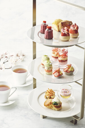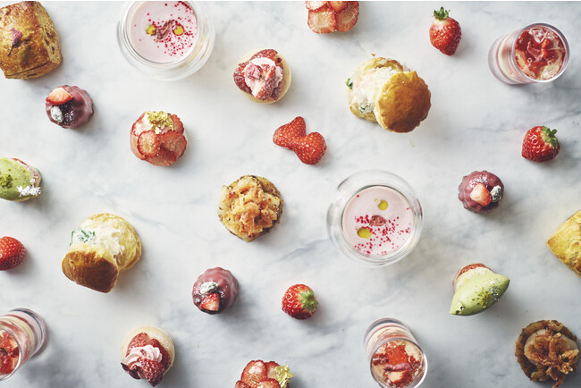 春の訪れを感じる、桜×いちごの最強コンビネーションをぎゅっと凝縮!キュートなビジュアルとは裏腹に、すっきりとした甘さのお米のババロアに日本酒のゼリーや桜を合わせた大人な味わいのパフェ、求肥に包まれた粒あんにスライスいちごをトッピングしたいちご大福、桜リキュールとコンソメゼリーの桜ヴィシソワーズなど、スイーツもセイボリーも春爛漫!淡く儚い桜ピンク、エモーショナルないちごの紅色、春に一斉に芽吹く草木のようなやわらかなグリーンと、見た目にも春の息吹を感じるココロ浮き立つアフタヌーンティーです。