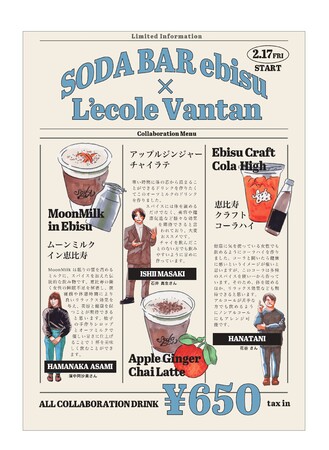 2月17日(金)より、レコールバンタンバリスタ応用科の生徒が考案したドリンクを3種類が『SODA BAR恵比寿店』にて発売いたします。