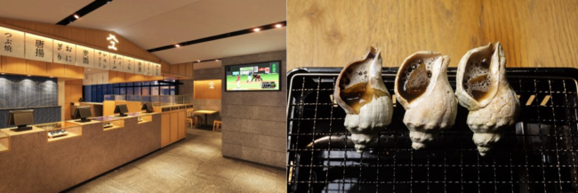 北海道産の新鮮な貝類を中心に取り揃え、居酒屋風の店内の雰囲気も引き込まれます。「名物つぶ焼き」(写真)は、稚内直送の青つぶを炉端でじっくりと焼き上げ、香りも楽しめる逸品です。店舗前はテラスになっており、夏はビール片手に海鮮浜焼きを味わってみては。