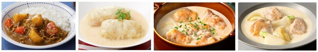 左から<カレーに>、<クリームソースに>、<ガーリックを加えて「シュクメルリ」に>、<ローレルやセロリを加えて「香味シチュー」に>