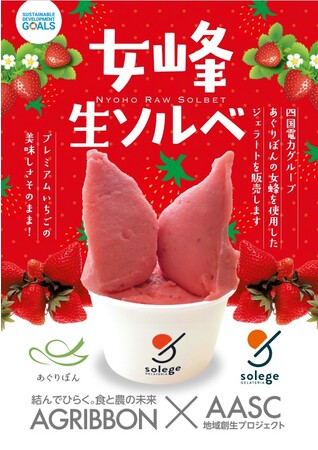 AASC地域創生本プロジェクトについて1.目的 地域創生を目指し、四国の農園活性化に貢献する2.連携先 あぐりぼん株式会社(https://agribbon.com/) 株式会社エイエイエスケータリング(http://www.aascatering.co.jp/html/home2.html) GELATERIA solege(https://solege.jp/) 株式会社グルメ杵屋(https://www.gourmet-kineya-hd.co.jp/)3.販売日時・販売先 2023年3月1日(水) ~ 期間限定 GELATERIA solege (北加賀屋本店・中之島美術館店・ラグザ大阪店・キッチンカー店)