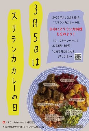 YouTubeチャンネル『スリランカTV うっちゃんねる』を運営する株式会社アクティブインターナショナル(本社:神奈川県川崎市、代表:内海由周)は、3月5日が「スリランカカレーの日」として日本記念日協会より正式登録されたことを受け、2023年2月23日(木・祝)~3月5日(日)まで、全国のスリランカ料理店と協力し、スリランカのイメージアップを図るキャンペーンを実施します。