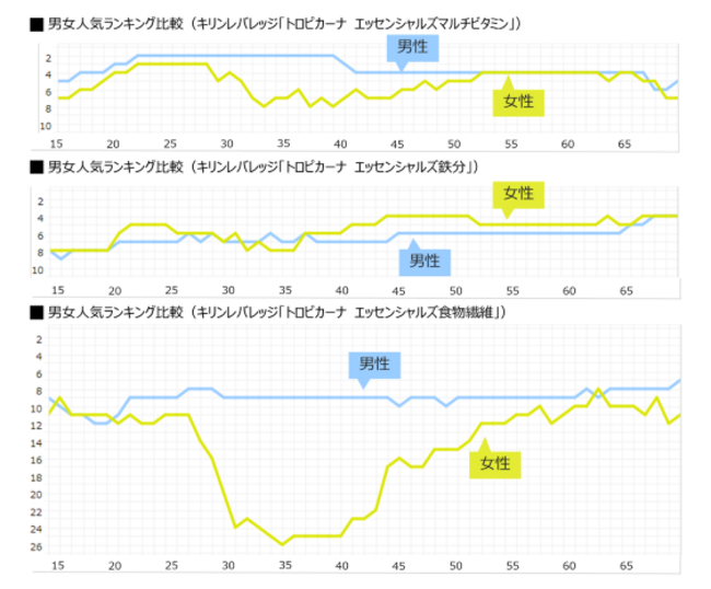 年齢の推移について見てみると、「トロピカーナ エッセンシャルズマルチビタミン」は20代でランキングが上昇し、その後若干ランキングが下降しています。「トロピカーナ エッセンシャルズ鉄分」は20代にかけて徐々にランキングが上昇し、30代以降安定した順位をキープしています。「トロピカーナ エッセンシャルズ食物繊維」については、30代にかけてランキングが下降しますが、40代以降で再度上昇する特徴的な動きを見せました。