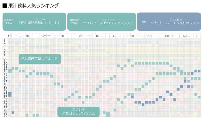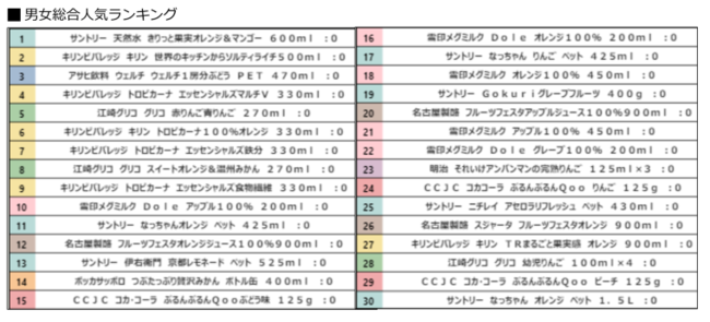 総合ランキング1位はサントリー「サントリー天然水 きりっと果実オレンジ&マンゴー」、2位はキリンビバレッジ「世界のKitchenからソルティライチ」、3位はアサヒ飲料「Welch's 1房分のぶどう」がランクインしました。ビタミンやポリフェノールを摂取できるものから熱中症対策ができるものまで、味だけではなく摂取できる栄養素もさまざまでした。性別や年齢によって購買する商品がどのように変化するのか、商品ごとに1歳刻みのランキングを読み解きます。