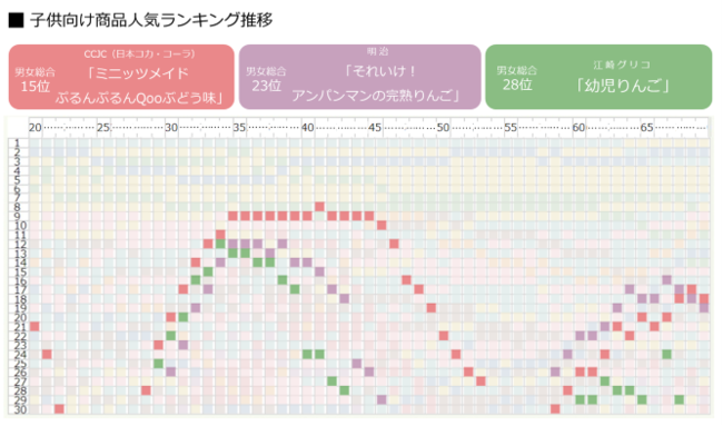 子ども向け商品について、ランキング15位のCCJC(日本コカ・コーラ)「ミニッツメイド ぷるんぷるんQoo ぶどう味」、23位の明治「それいけ!アンパンマンの完熟りんご」、28位の江崎グリコ「幼児りんご」を比較しました。
