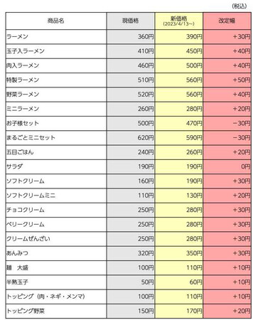 大変心苦しい思いですが、商品の品質維持と安定供給を図るため、「スガキヤ」の主力商品である「ラーメン」を税込360円から税込390円に、その他商品も税込10円~50円の幅で、やむを得ず商品の価格を改定させて頂きます(※1)。なお、「お子様セット」と「まるごとミニセット」は税込30円の値下げをさせて頂きます。