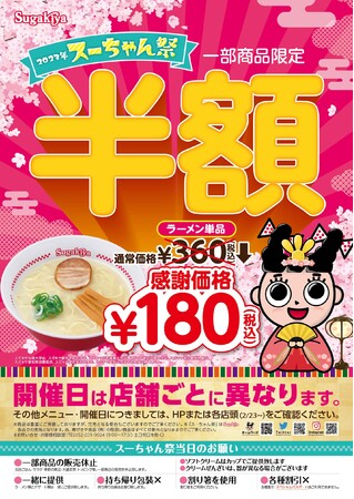 このような状況下ではありますが、日頃よりスガキヤをご愛顧いただいている皆様へ感謝をお伝えすべく、この3月にスガキヤ店舗で5年振りとなる「半額祭(スーちゃん祭2023 ※2)」を開催させて頂きます。皆様のご来店を心よりお待ちしております。