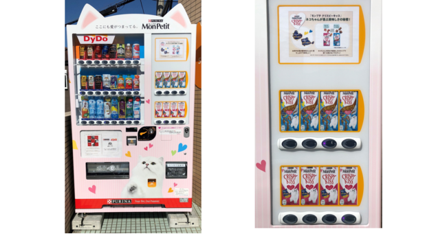 本自販機では、ネコリパでの保護猫事業の支援を目的に、ネスレ ピュリナと協力し、実現したもので、飲料とともにネスレ ピュリナが展開しているネコ用おやつ「モンプチ クリスピーキッス」シリーズ2種を販売し、その売上の一部は、ネコリパの活動に役立てられます。