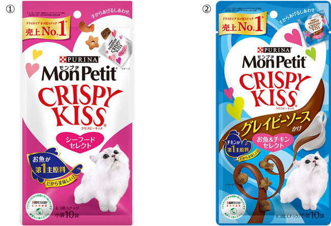 (3)販売するネコ用おやつ「モンプチ クリスピーキッス」シリーズ(各200円 税込)