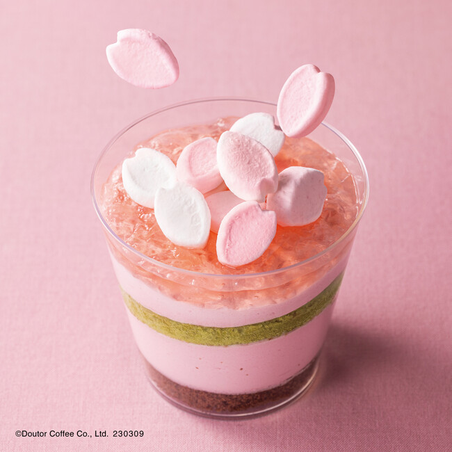 天面には、さくら風味のクラッシュゼリーと、さくらの花びらの形をしたマシュマロをトッピング。