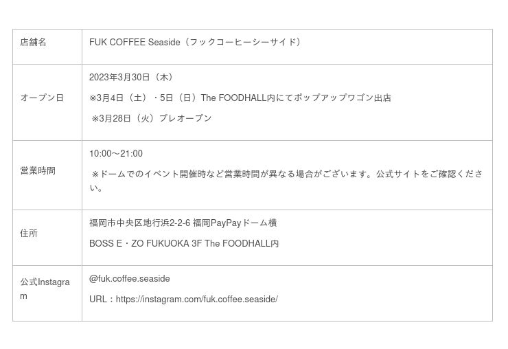 福岡のコーヒーブームを牽引している“FUK COFFEE”が新店舗としてオープンする「FUK COFFEE Seaside」では、SNSでも大人気のコーヒーやプリンはもちろん、ここでしか食べることのできない限定メニューの販売もございます。また、店名に「Seaside」とある通り、海岸まで歩いてすぐ行けるため、心地よい海風を浴びながらスペシャルティコーヒーをお楽しみいただけます。さらに、ホークスが運営するBOSS E・ZO FUKUOKA内にある店舗ならではのホークスコラボメニューなどの展開や、試合開催日は球場内で美味しいコーヒーを片手に野球観戦も満喫できます。