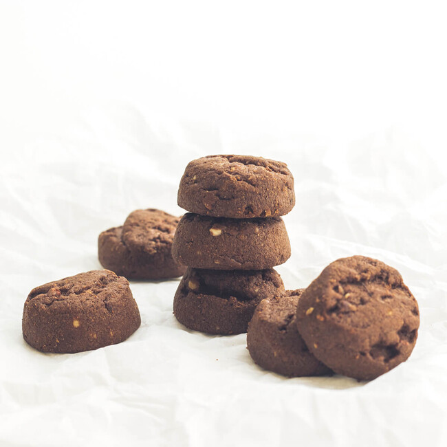 マスコバド糖は、サトウキビの搾り汁を煮詰めて乾燥させた黒糖。マスコバド糖は美味しいのはもちろんのこと、フィリピンの農民の自立を応援するフェアトレード品という顔もあります。オランダ産の良質なココアパウダーとマイルドな苦みと、豊かな香りを持つペルーで収穫されたクリオロ種のカカオニブを練り込みサクサクカリカリの食感に仕上げました。ダブルカカオの濃厚な風味が口の中で広がり、カカオ好きにはたまらない少し大人向けのクッキーです。