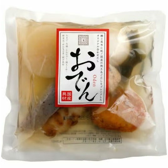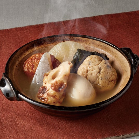 鰹と昆布に、紀ノ国屋の焼きあごだしをブレンドしたオリジナル合わせだし。たまごや大根、こんにゃく、焼きちくわ、野菜天、がんもどき、結び昆布まで、定番具材をバランスよく詰め合わせました。
