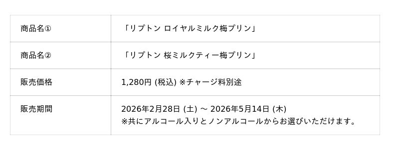チョーヤ梅酒株式会社 (本社:大阪府羽曳野市、社長:金銅重弘、以下チョーヤ) は、梅酒カクテル専門店「The CHOYA 銀座BAR (ザ チョーヤ ギンザバー) 」にて、リプトン イエローラベル製品と完熟南高梅を使用したコラボレーションメニュー「リプトン ロイヤルミルク梅プリン」「リプトン 桜ミルクティー梅プリン」の2種類を2026年2月28日 (土) から5月14日 (木) まで期間限定で販売します。