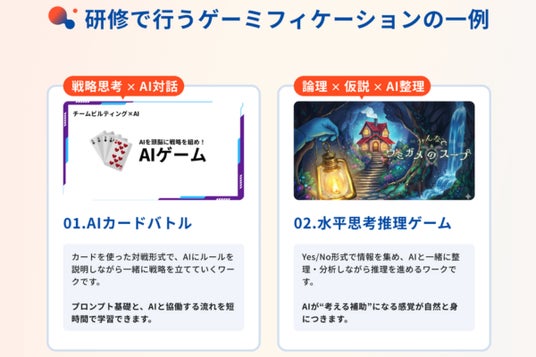 当社はこれまでの研修や生成AIスクール『AISEE』の提供で培ったリスキリングの知見より、「楽しさ」が「学習意欲」を最大化する点に着目。座学中心の研修を一新し「ゲームを攻略していたら、いつの間にかAIを使えるようになっていた」という体験を提供する『ゲーミフィケーション型生成AI研修』を提供開始しました。