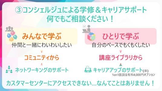 - 学習サポート:学習相談・進捗サポート/学習交流会/(希望者向け)キャリア支援・事業構想発表機会 等