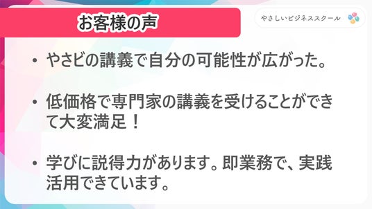 - 受講料:80,000円(税込)※既存「やさビ永久会員」:50,200円(税込)/既存「やさビ年間会員」:70,200円(税込)
