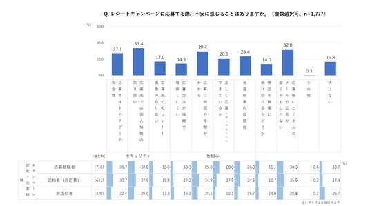 次に、キャンペーン認知・応募経験別に見ると、認知しているものの応募経験がない層では、他と比較した際に不安項目の回答率が高い傾向がみられました。特に「応募に時間や手間がかかる」では、応募経験者と比べて9.6ポイントほど高くなっています。一方、応募経験者は「正しく応募(アップロード)できているか」を気にしています。