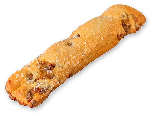 ラム酒に漬け込んだくるみを生地に練り込み、白ざら糖をまとわせて焼き上げた、香ばしさとやさしい甘さが広がる、食べやすいスティックパンです。