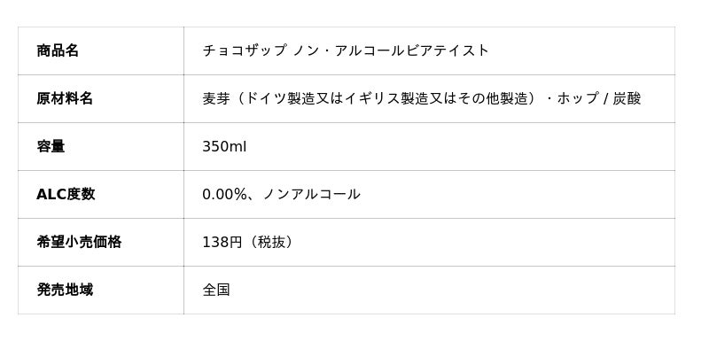 ●チョコザップ ノン・アルコールビアテイスト添加物(炭酸を除く)・甘味料を使用せず、ドイツやイギリスなど本場ヨーロッパの大麦 麦芽を100%使用し、ホップ、そして炭酸のみで製造しました。甘味料に頼らず、素材への こだわりと製法の工夫により、ノンアルコールでありながら麦本来のふくよかなコクと深い 味わいを実現しています。日常の様々なシーンで、本格的なビールの喉越しを「罪悪感ゼロ」でお楽しみいただけます。