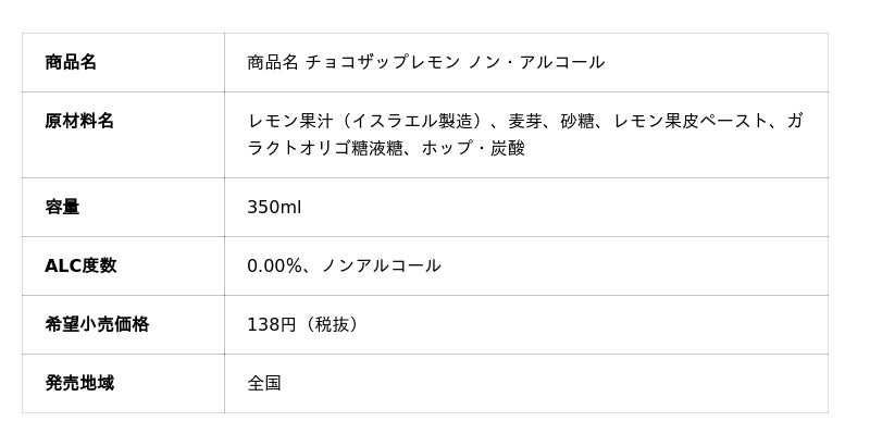 ●チョコザップレモン ノン・アルコール本格的なビアテイストをベースに、イスラエル産レモン果汁とレモン果皮ペーストを贅沢にブレンドしました。さらに、健康をサポートするガラクトオリゴ糖をプラスしました。レモン本来のキリッとした酸味と爽快感は、トレーニング後のリフレッシュにはもちろん、 普段お酒を飲まない方にもおすすめです。
