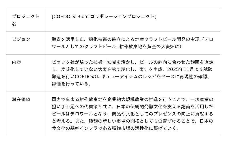 コエドブルワリー(株式会社協同商事)は、老舗種麹メーカーの株式会社ビオックと共に、酵素を活用した糖化技術の確立による地産クラフトビール開発の実現に向けコラボレーションプロジェクトを開始しました。