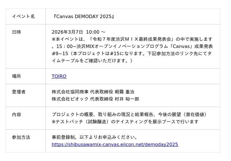 本プロジェクトの具体的な内容と今後の展望について、一般公開のプレゼンテーションイベントにて下記の通り実施いたします。また会場内では展示ブースを設けております。そちらでもプロジェクトのご説明と試験醸造品の試飲も可能です。ぜひお立ち寄りください。