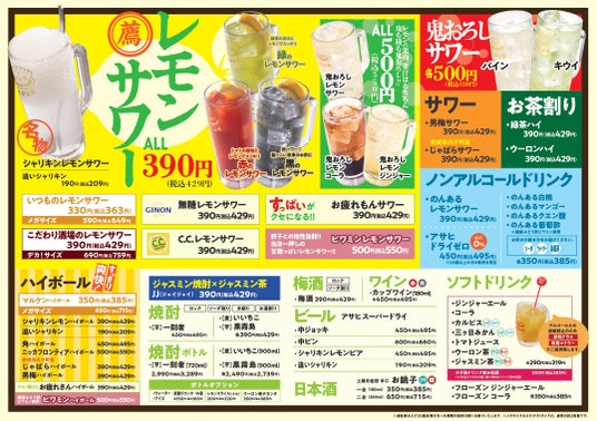 レモンの果肉も、果汁も丸ごとすりおろした、フレッシュ感あふれる進化型サワーです。鬼おろしレモンサワーのほか、レモンコーラ、レモンジンジャーなど多彩に展開します。