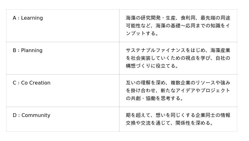 第二期では、海藻の活用を食利用に限らず、さらに多業種へと広げ、企業同士が協力して新しいビジネスや製品を創り出す機会を提供します。また第一期の参画企業との交流も加わるため、海藻産業が他産業との連携でどのように発展していくか、実践的なプロジェクト創出を目指します。