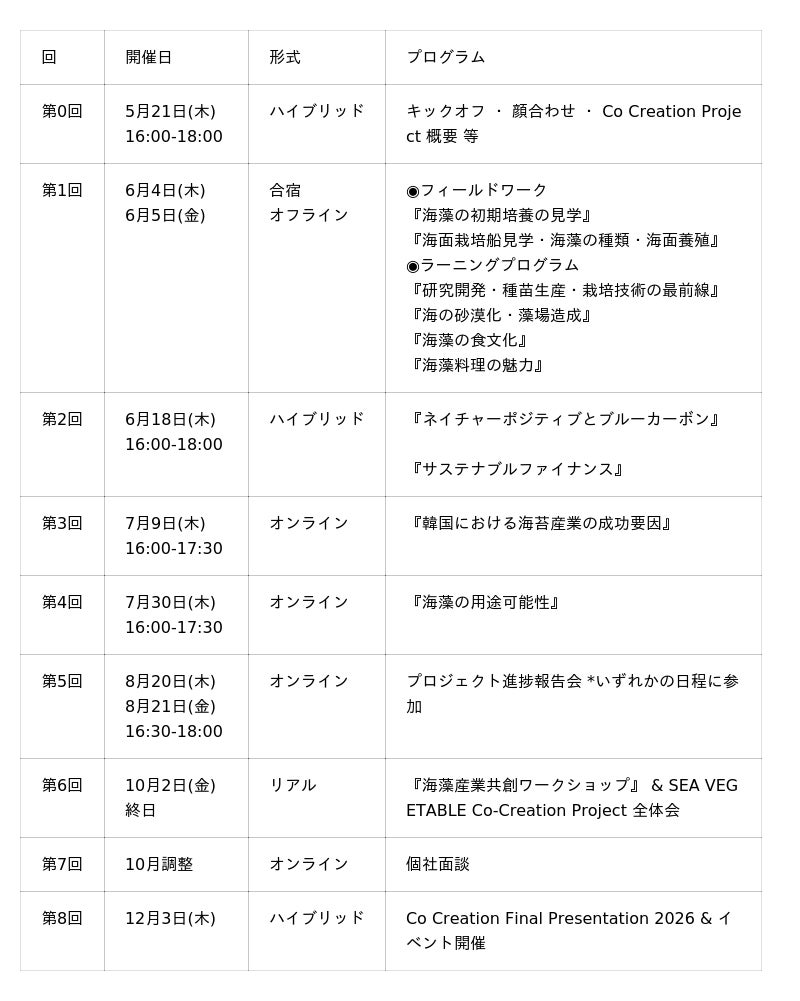 シーベジタブルは小さなスタートアップながら、海藻を取り巻く環境変化に向き合い、研究・生産・加工・販売・飲食まで、さまざまな専門性を持つ社内外の仲間たちとともに、川上から川下へと活動の幅を広げてきました。それでも、「海藻で 海も人も すこやかに」という未来を本気で実現しようとすると、海はあまりに広く、自分たちはあまりに無力だと感じる瞬間があります。だからこそ、現状を動かす力を持つ多業種の皆さんと協働していくしかない。そんな思いから、このプログラムを立ち上げました。第1期には、日本を代表する素晴らしい企業の皆さまにご参画いただき、濃密な対話と実践を重ねてきました。新たな仲間が加わることで、海藻とともにこの世界にどんな希望を描けるのか。今からとても楽しみにしています!