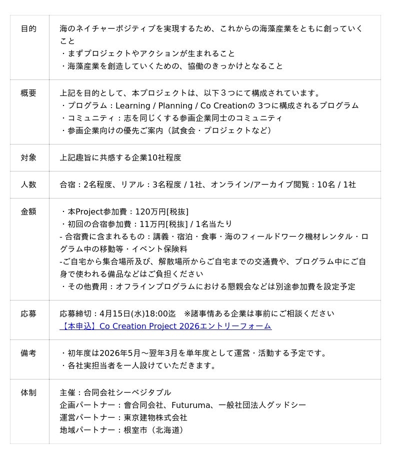 合同会社シーベジタブル(共同代表:蜂谷 潤、友廣 裕一、本社:高知県安芸市)は、持続可能な海藻産業を共創するための「SEA VEGETABLE Co Creation Project(以下、CCP 2026)」第二期への参加企業を募集開始します。第一期では、12社の企業が参画し、海藻を活用した新しいビジネスアイデアを共に創出しました。