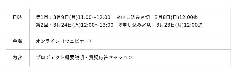 ※本プロジェクトにご関心のある企業・団体向けの説明会となります。本プロジェクトの趣旨と異なるご参加、当社の事業領域と重なる企業・団体のご参加はお断りさせていただく場合がございます。あらかじめご了承ください。