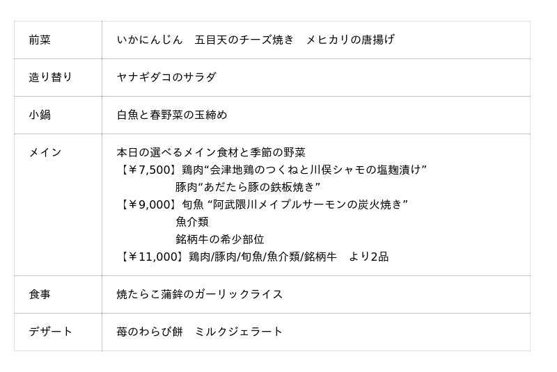 食の宝庫と言われる福島県の食材を使用した、前菜からデザートまで福島の味をお楽しみいただけるコース料理です。メインは料理長が厳選した数種類の食材の中からお選びいただけ、炭火焼きや鉄板焼きなど食材に合わせた調理法で仕上げてご提供いたします。