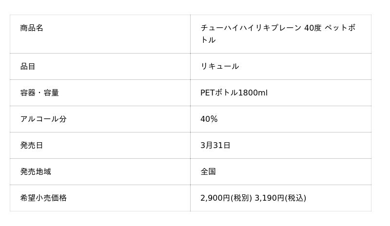 『チューハイハイリキプレーン 40度 ペットボトル 1800ml』は、原液と炭酸水を1:5で割るだけで“クリアですっきりとしたプレーンチューハイ”が楽しめる業務用向け商材です。「ハイリキ」は1983年に発売した日本初のチューハイブランドで、食事を引き立たせるすっきりとした飲み飽きることのない味わいが特長です。近年、食中酒に「すっきり・甘くない」味わいへのニーズが高まる中、飲食店において簡便に提供できるコンクを展開することで、老舗の大衆酒場を中心にご支持いただいている「ハイリキ」の飲用機会拡大を図ります。