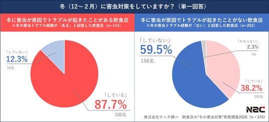 Q1の結果を“冬の害虫トラブル経験の有無”で分けてみると、トラブル経験のある飲食店は87.7%が冬も対策を「している」と回答。一方、トラブル経験のない飲食店の59.5%は「していない」と回答しました。