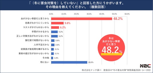 Q1で「(冬に害虫対策を)していない」と答えた飲食店にその理由を聞いたところ、「虫が少ない季節だと思うから」との回答が48.2%と一番多く、「効果が分かりにくいから」「コストがかけられないから」が続く結果となりました。