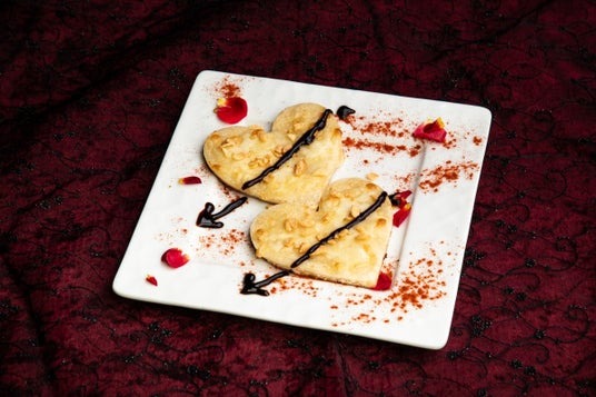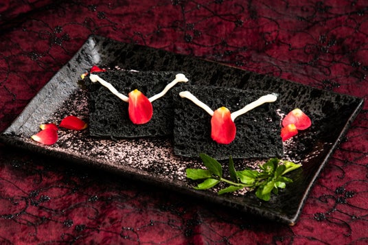 魔力に翻弄されている内に宴はあっという間にフィナーレの時。姿を現すのは、しっとりと濃厚なガトーショコラ、甘い香りを放つバニラアイス、そしてホワイトチョコレートのハート…そして血の如く赤いベリーのソースが!愛は”甘い”だけに留まらないことを、何故か吸血鬼が示す象徴的なデザートです。