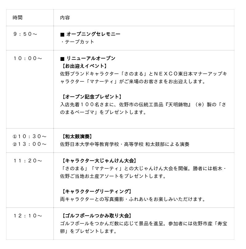 2. オープニングイベントでは、佐野ブランドキャラクター「さのまる」とNEXCO東日本マナーアップキャラクター「マナーティ」登場。大じゃんけん大会やグリーティングを実施します。また、和太鼓演奏や佐野市産「寿宝卵」がもらえるゴルフボールつかみ取り大会などのイベントもご用意しています。