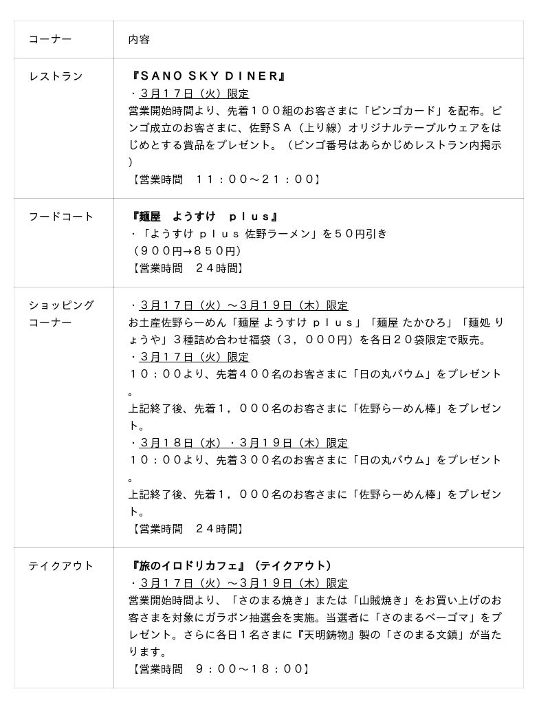 「ドラマチックエリア佐野(上り線)」オープニングイベント・キャンペーン