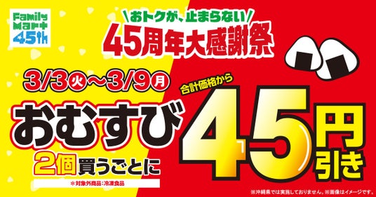 ファミリーマート創立45周年にちなみ、期間中おむすびを2個買うごとに合計価格から45円引きいたします。中具増量商品も対象となるため、ボリュームもおトクさも同時に体験いただけます。
