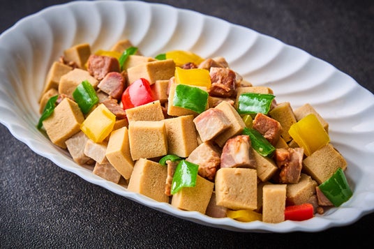 【中国料理】福島県会津地方の郷土食材「凍み豆腐」と広東風叉焼を組み合わせた「会津凍み豆腐と叉焼の和え物」をぜひご賞味ください。叉焼の旨みをしっかりと吸収した凍み豆腐は、ご飯にもお酒にもぴったりの一品です。