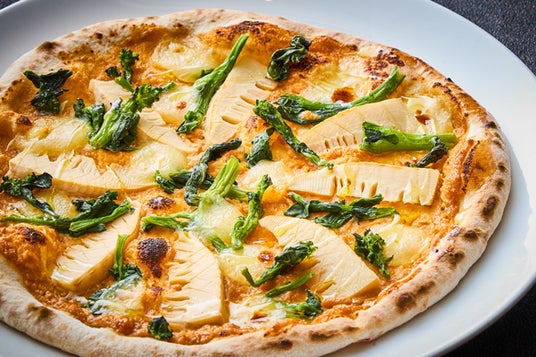 4品目にご紹介するのは、コクと深い旨みが特徴の「会津味噌」を使用した特製「ピッツァ」です。芳醇な香りの味噌とチーズの相性は抜群。深みのある味わいの生地の上で、旬の筍の食感と、菜花のほろ苦い風味が絶妙なアクセントを生み出します。春ならでは味覚をお楽しみください。