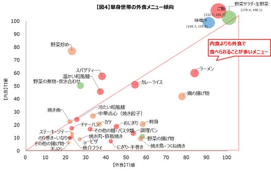 図4は、夕食シーンにおける単身世帯の外食時のメニュー傾向を示しています。表示しているメニューは2025年の外食TI値上位30メニューです。グラフは横軸に外食時のTI値、縦軸に内食時のTI値をとっており、赤い三角形内に位置するメニューは、内食よりも外食で特に出やすいメニューであると読むことができます。